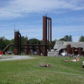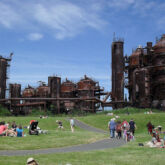 Gas Works Park incorporates numerous pieces of the old plant. Some stand as ruins, while others have been reconditioned, painted, and incorporated into a children’s “play barn” structure, constructed in part from what was the plant’s exhauster-compressor building.