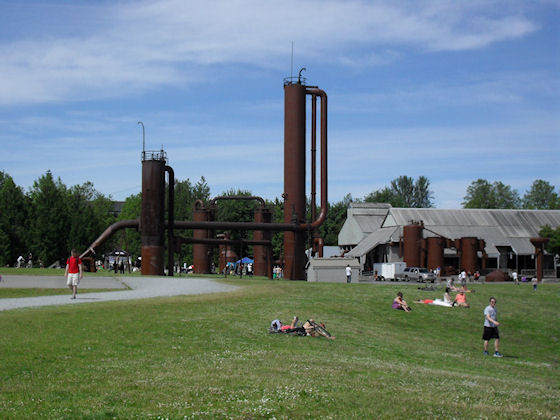 Gas Works Park incorporates numerous pieces of the old plant. Some stand as ruins, while others have been reconditioned, painted, and incorporated into a children’s “play barn” structure, constructed in part from what was the plant’s exhauster-compressor building.